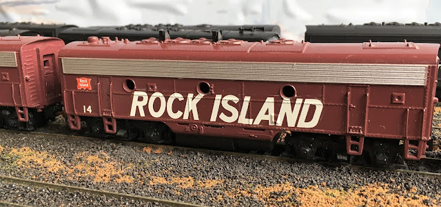 Another speed lettering maroon painted Athearn Blue Box F7B. All of the Rock Island units were gifts from my train buddy Jeff Miles. Jeff was an Engineer for the Santa Fe and several short lines. He was a big member of the Rock Island Technical Society, where we first met. Jeff passed away not long after he gave me these units. A little P.C.C.M. tribute to "Engineer Jeff".